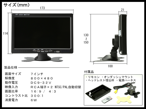 汎用 7インチ オンダッシュ モニター 正像 鏡像 上下の反転機能付き 12v 24v兼用 W 21